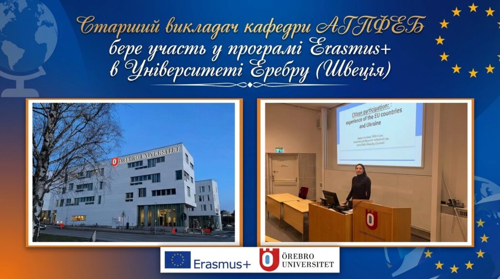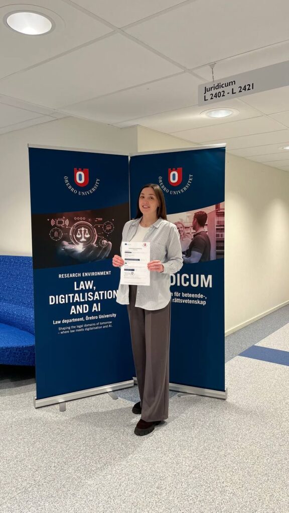 Старша викладачка кафедри адміністративного, господарського права та фінансово-економічної безпеки (АГПФЕБ), доктор філософії з права Надія Горобець, успішно завершила програму міжнародної академічної мобільності Erasmus+ Staff Mobility for Teaching. Візит тривав з 16 по 29 березня на базі престижного Університету Оребру, що є одним із провідних освітніх центрів Швеції.