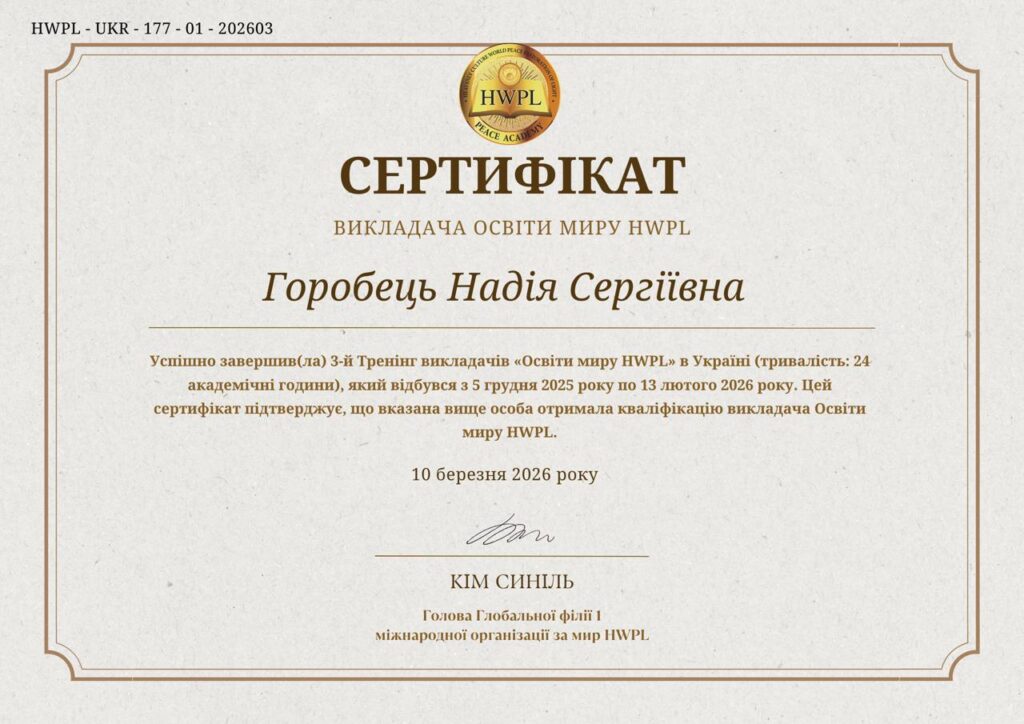 Старша викладачка кафедри АГПФЕБ Надія Горобець взяла участь у 3-му Тренінгу викладачів «Освіти миру HWPL» в Україні, який тривав з 5 грудня 2025 року по 10 березня 2026 року та об’єднав освітян з усієї країни.