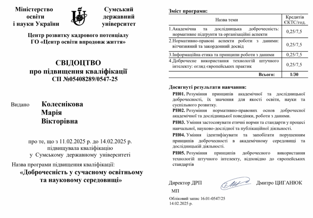 Колеснікова Марія Вікторівна, представник кафедри адміністративного, господарського права та фінансово-економічної безпеки Сумського державного університету, успішно пройшла підвищення кваліфікації за програмою “Доброчесність у сучасному освітньому та науковому середовищі”. Навчання відбулося з 11 лютого по 14 лютого 2025 року в Центрі розвитку кадрового потенціалу СумДУ, з обсягом 1 кредит ECTS (30 годин). Програма охопила теми від академічної […]