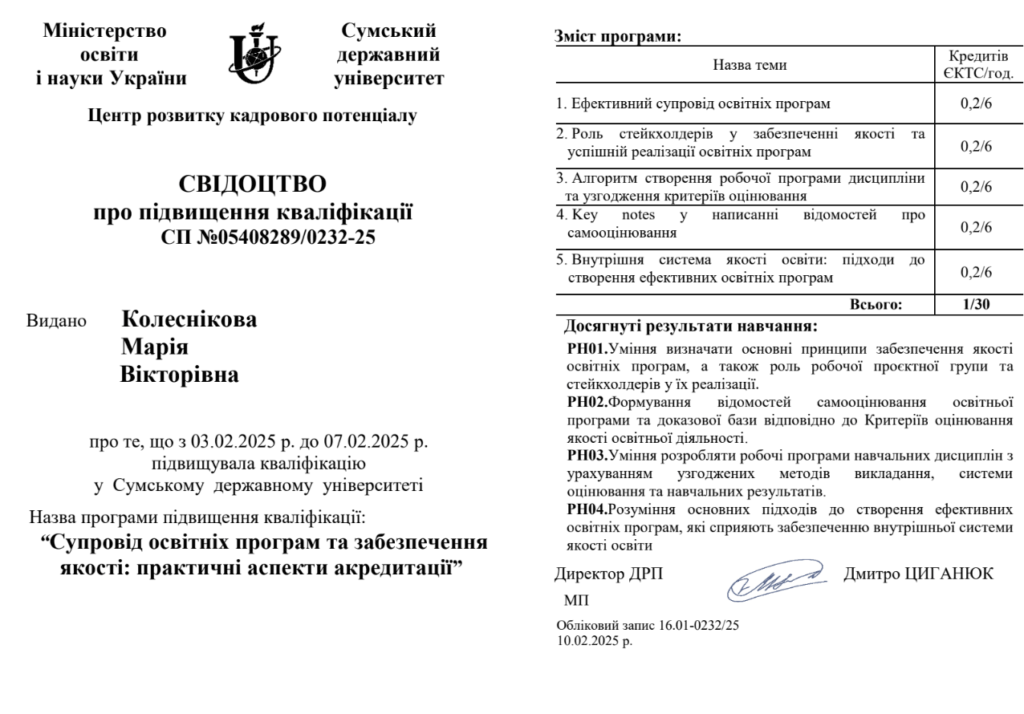 Кафедра адміністративного, господарського права та фінансово-економічної безпеки Сумського державного університету пишається досягненнями свого викладача Колеснікової Марії Вікторівни, яка завершила програму підвищення кваліфікації “Супровід освітніх програм та забезпечення якості: практичні аспекти акредитації”. Курс проходив з 3 лютого по 7 лютого 2025 року в Центрі розвитку кадрового потенціалу СумДУ, з обсягом 1 кредит ECTS (30 годин). У […]