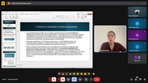 Спікеркою заходу стала Надія Горобець, старший викладач кафедри, яка виступила з лекцією на тему «Інститут викривачів як форма участі громадян у запобіганні корупції: досвід країн ЄС та України».