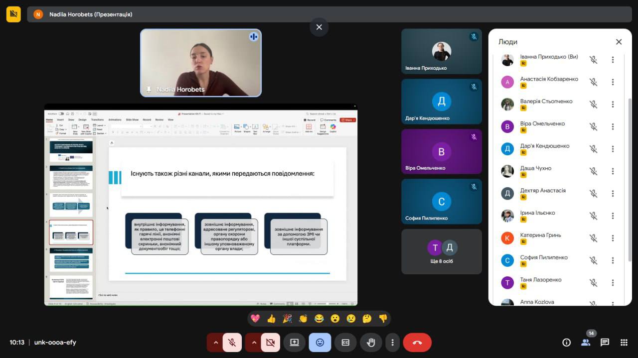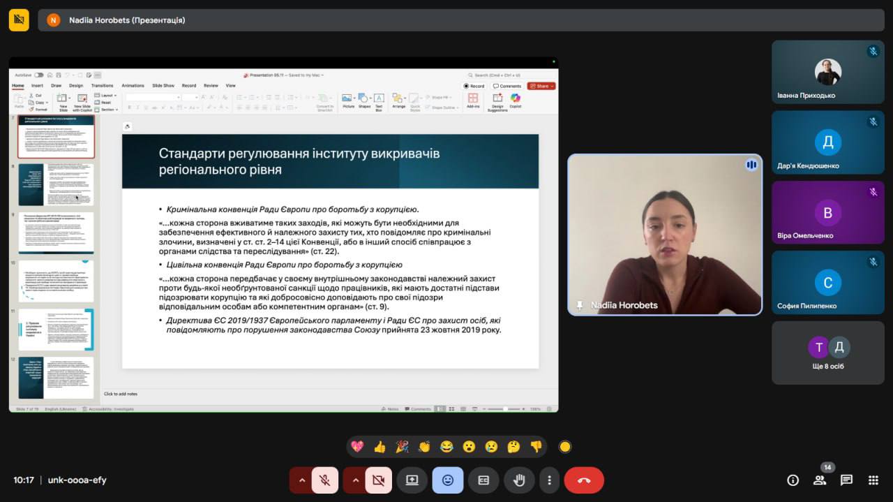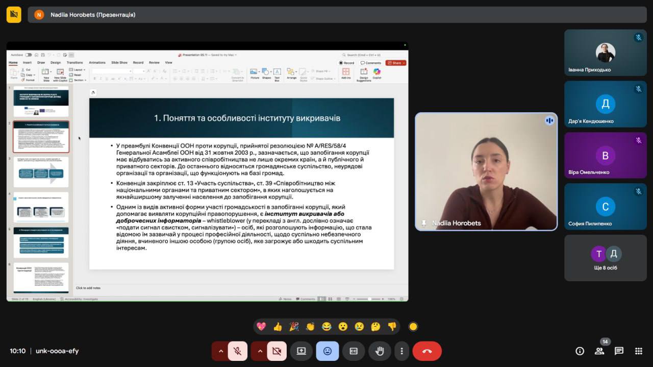 Під час зустрічі було розглянуто сутність і значення інституту викривачів як важливого механізму демократичної участі громадян у боротьбі з корупцією. Пані Надія проаналізувала європейський досвід функціонування цього інституту, зокрема практику держав ЄС щодо правового захисту викривачів, та окреслила ключові виклики, з якими стикається Україна під час впровадження відповідних антикорупційних норм.